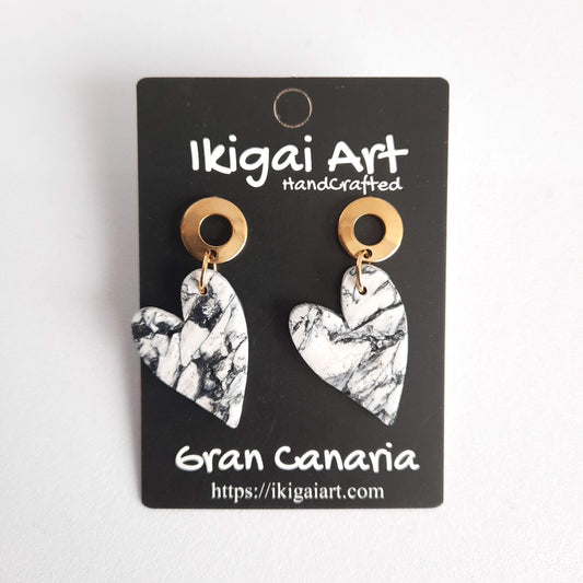 Pendientes Corazón Hueco Blanco Mármol con Base Acero Dorada o Negra