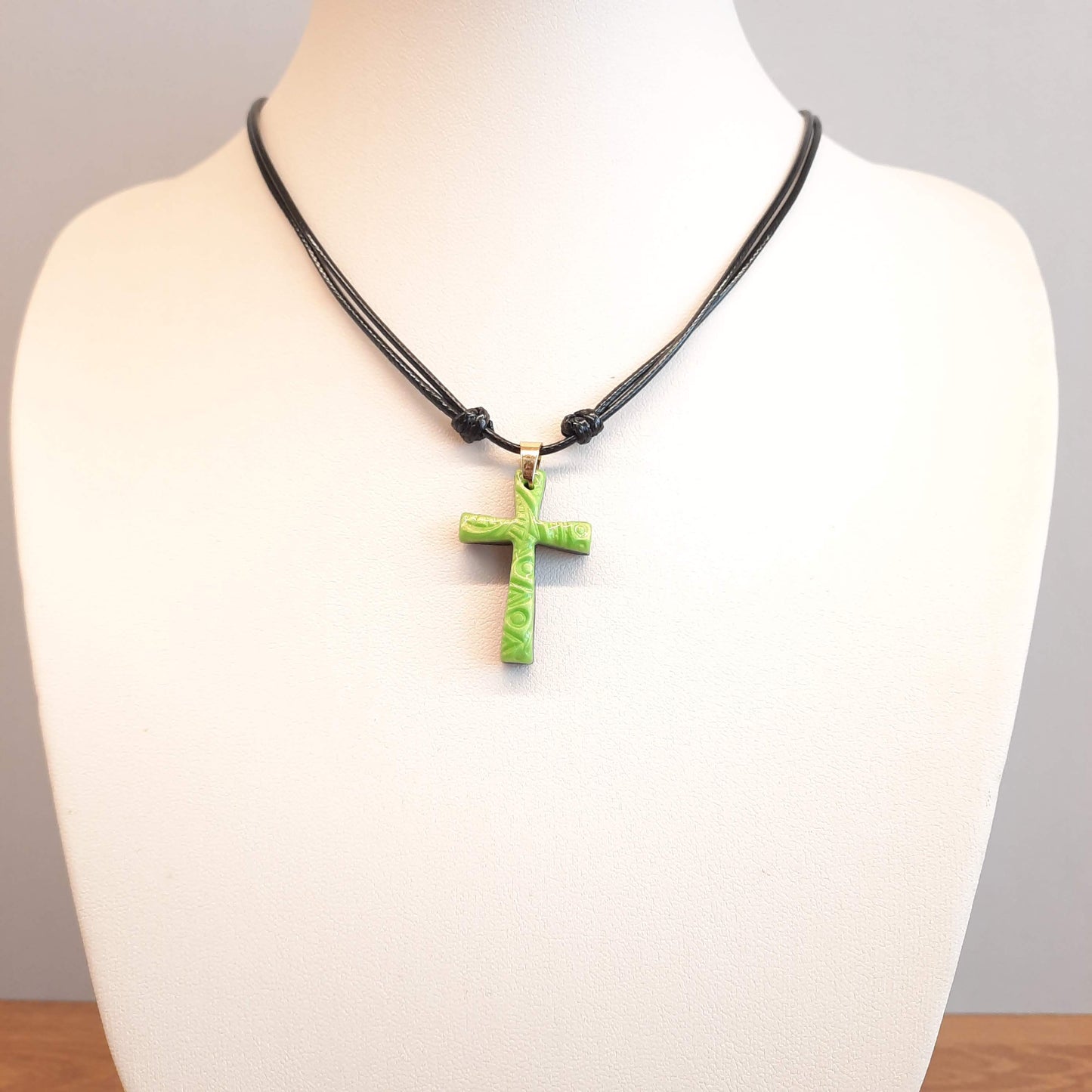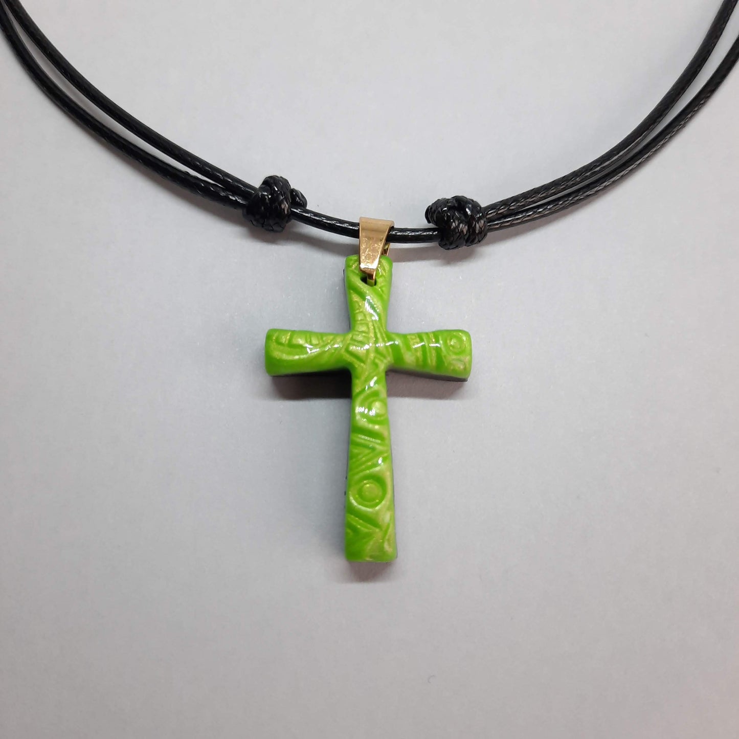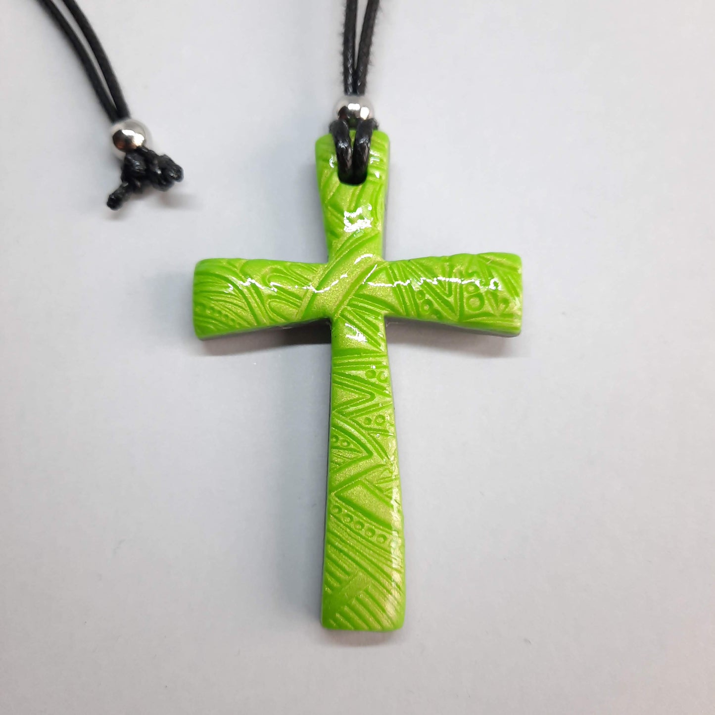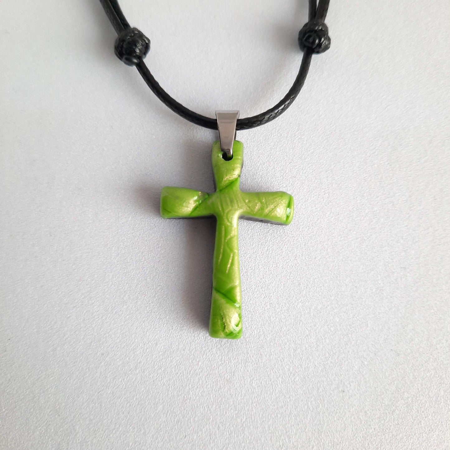 Collar de arcilla polimérica hecho a mano, con forma de cruz, con patrón de color verde, se le añade una capa de resina así que bajo la luz del sol se exalta el brillo, cordón ajustable de algodón encerado y bolitas de acero inoxidable.