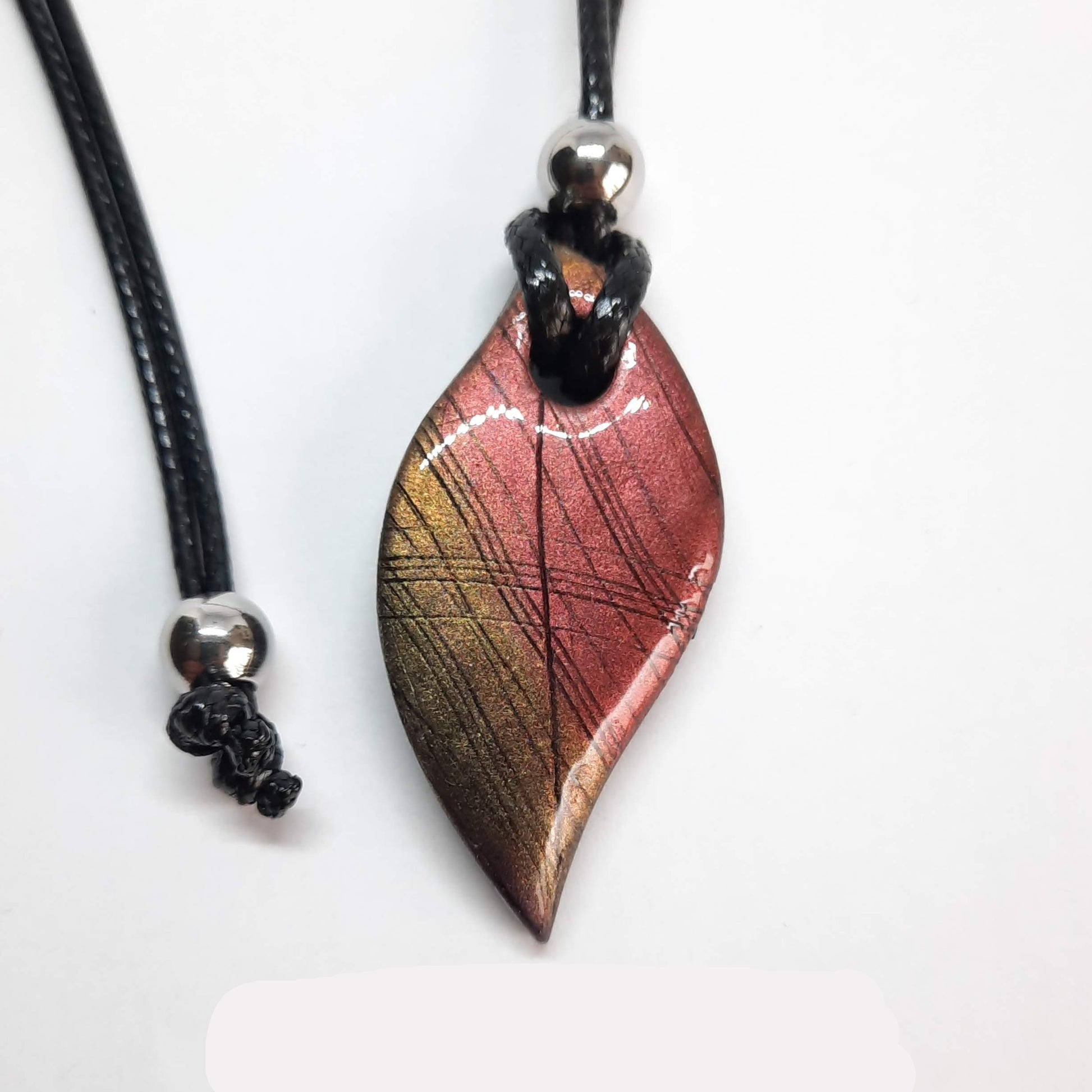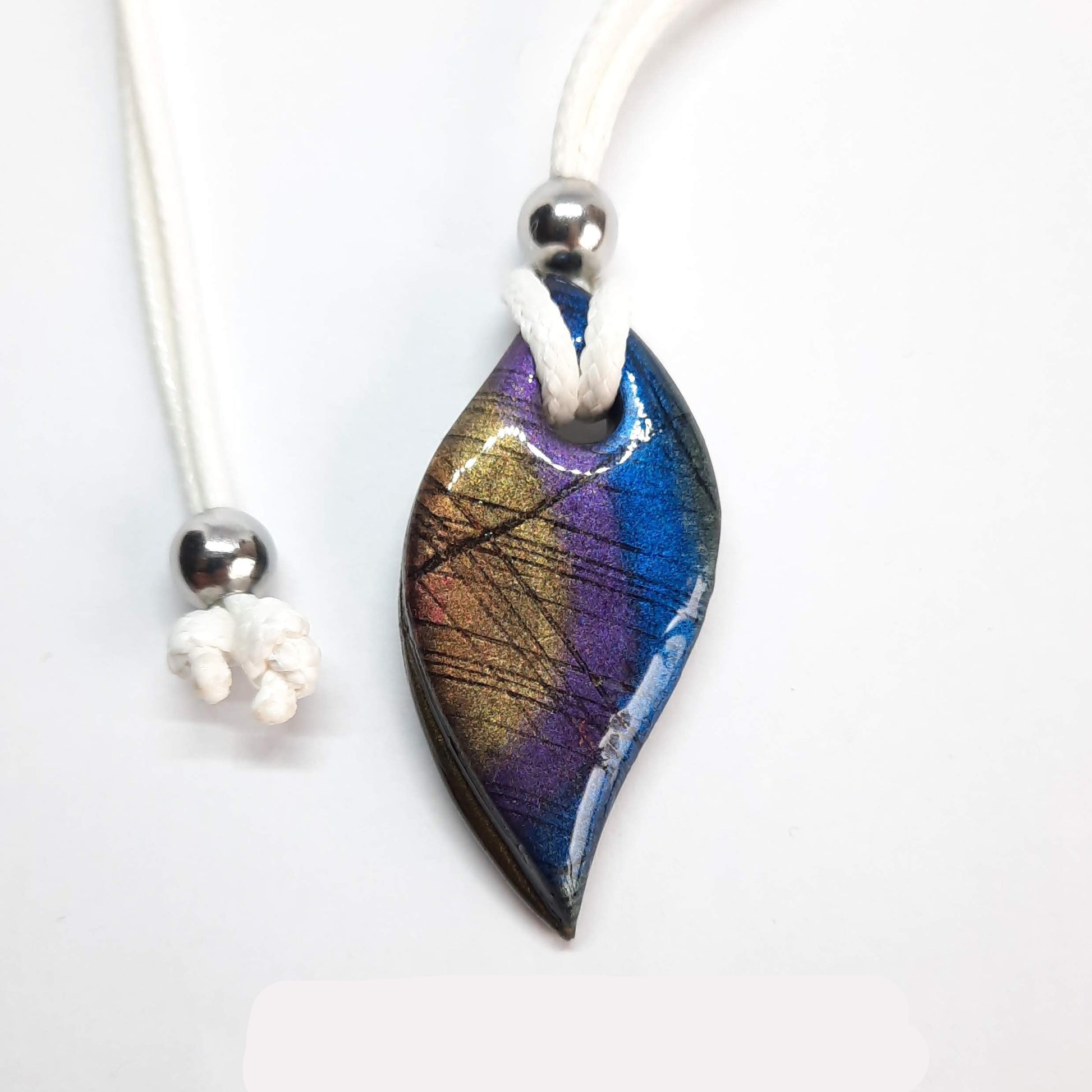 Collar artesanal con forma de fantasía hecho de arcilla polimérica, imitando la piedra labradorita violeta y con un acabado de resina que intensifica su brillo al sol, cordón ajustable de algodón encerado y bolitas de acero inoxidable.