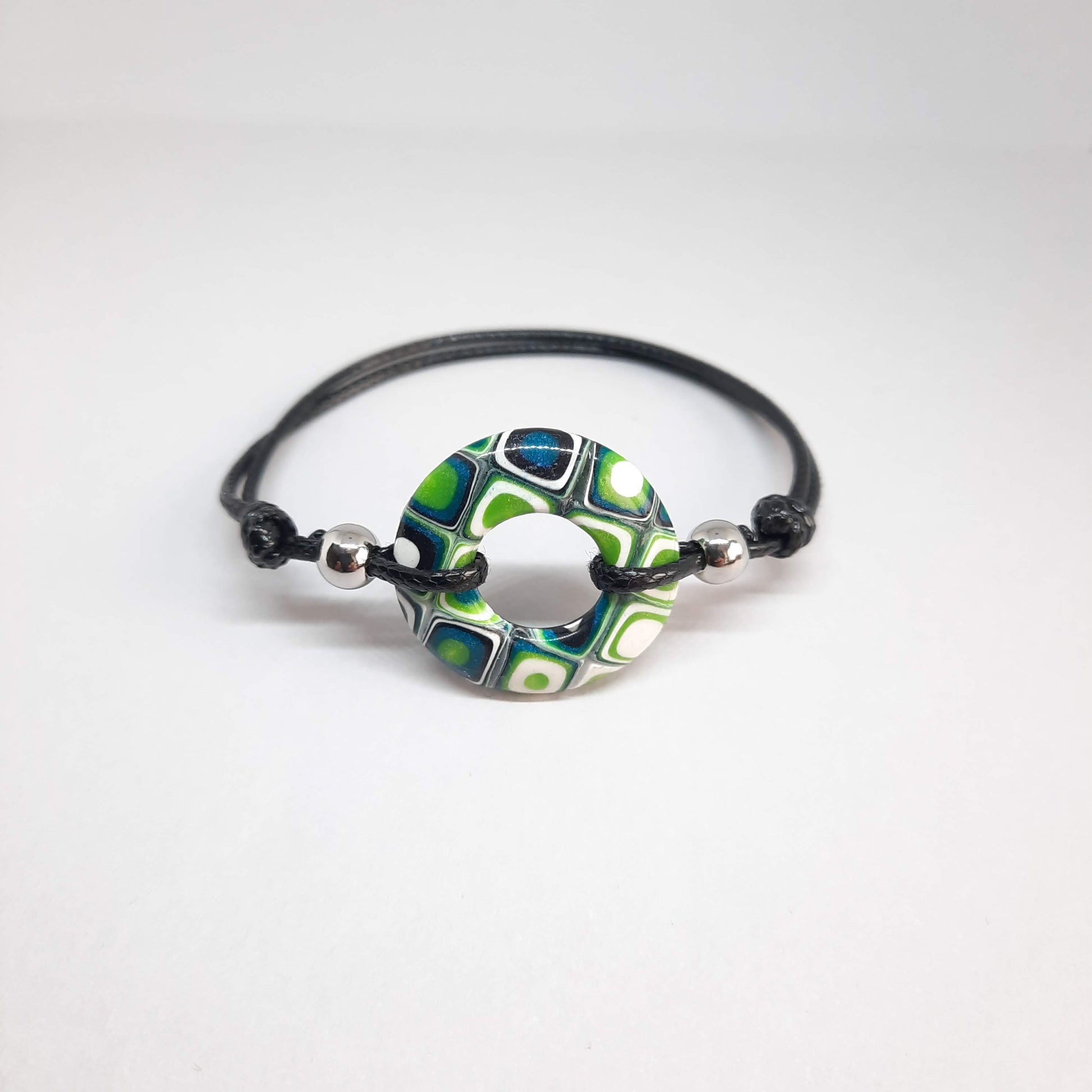 Brazalete hecho a mano de arcilla polimérica en forma de donut, con patrón de color verde, azul, blanco y negro, se le añade una capa de resina así que bajo la luz del sol se exalta el brillo, y cuenta con un cordón ajustable de algodón encerado con nudos corredizos y cuentas de acero inoxidable.